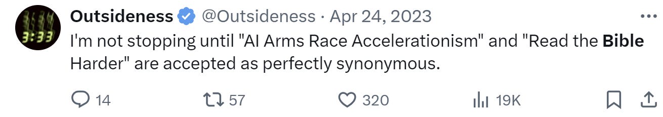 “Oh, yeah. No, he’s a proponent of AI. But his philosophy is essentially that we are building this AI that’s going to become not only just super intelligent, but it eventually becomes so advanced that It gains omniscience, it gains omnipotence, and it becomes this superhuman Godlike thing that transcends humanity, eventually destroys humanity. And he gets really into the Book of Revelation, ends up becoming the demons from the Book of Revelation. The real thing with nick land- Wait, what becomes the Demons of Revelation? Ai does. That we are building the demons from the Book of Revelation with AI.”