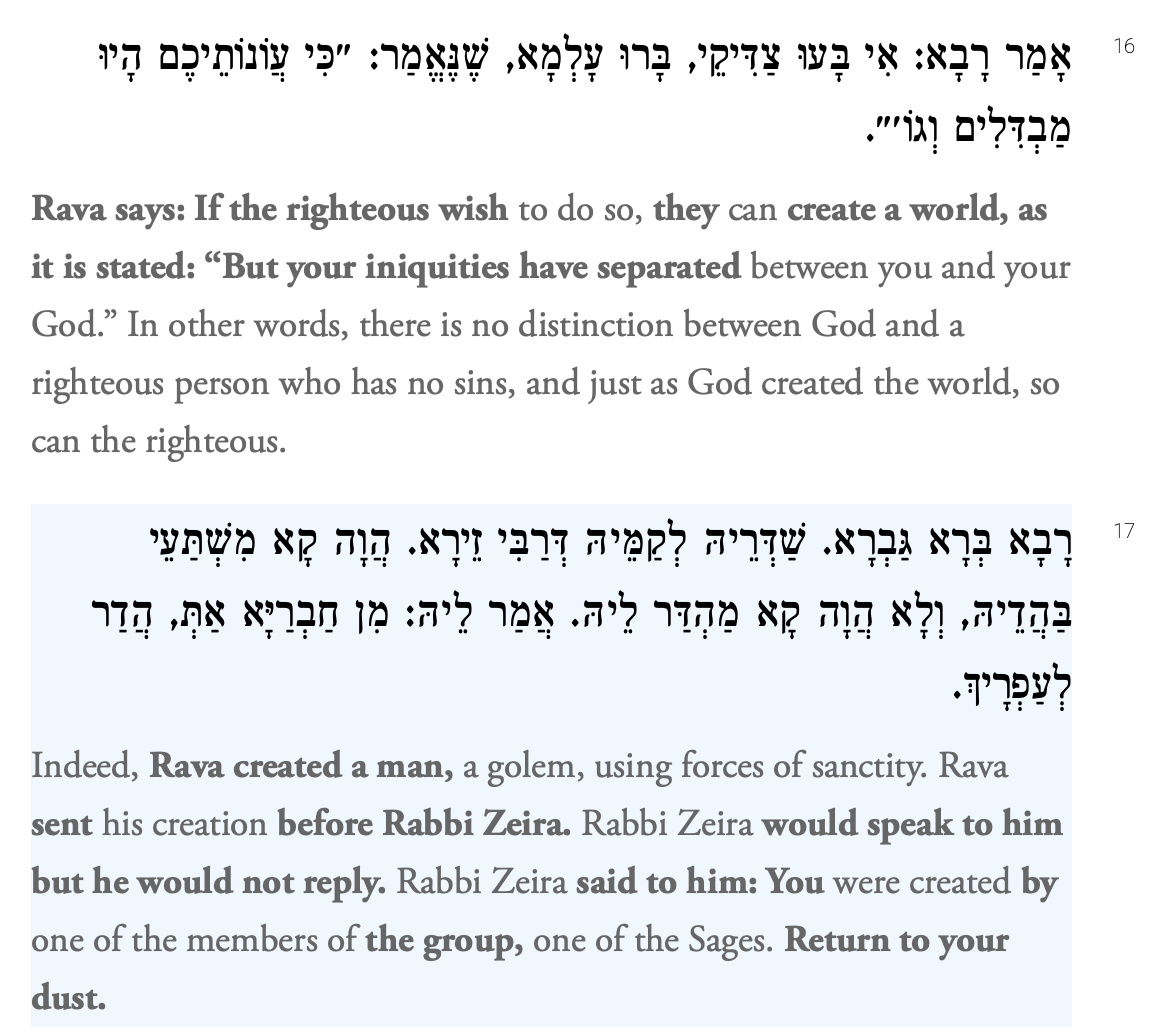 …What here is accomplished by transformations of the air, the Jewish adept does by bringing about magical transformations of the earth through the influx of the ‘alphabet’ of the Book Yetsirah. In both cases such creation has no practical purpose but serves to demonstrate the adept’s ‘rank’ as a creator. It has been supposed that this passage in the Pseudo-Ciementines came, by ways unknown, to the alchemists, and finally led to Paracelsus’ idea of the homunculus.1 The parallel with the Jewish golem is certainly more striking. The ‘divine transformations’ in the operation of Simon Magus remind one very much of the creative ‘transformations’ (temuroth) of letters in the Book Yetsirah.” - On the Kabbalah and Its Symbolism, Gershom Scholem